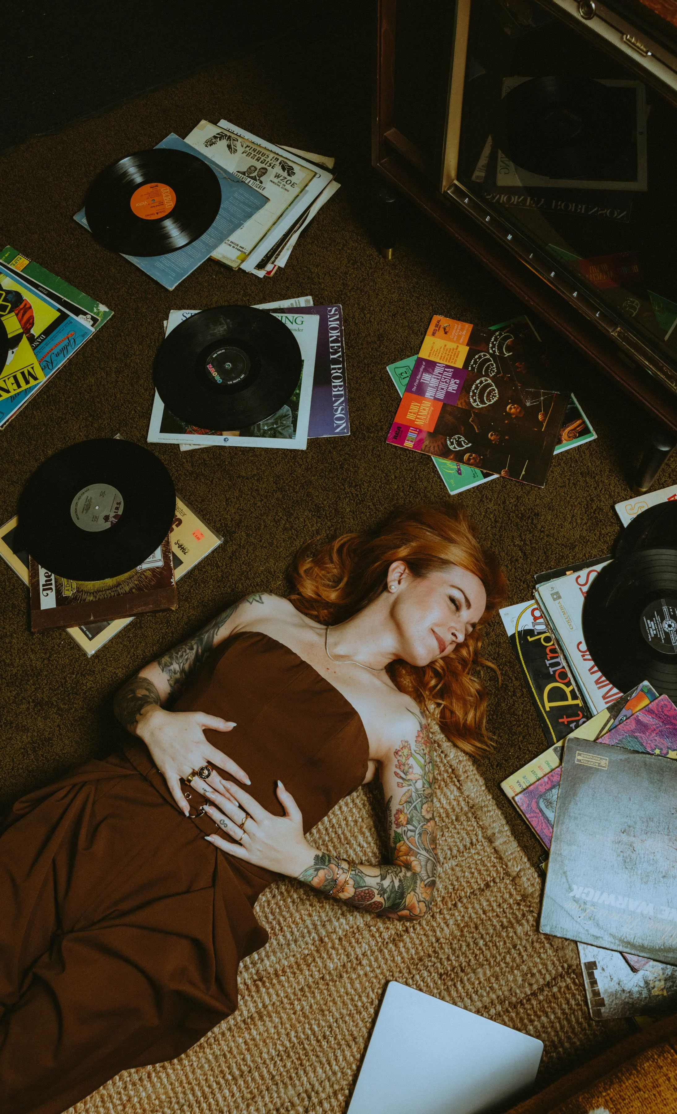 Props throughout e.g., records, her signature red hair color, an old phone — nodded to her California roots and music background as visual metaphors for rhythm, creativity, and momentum.